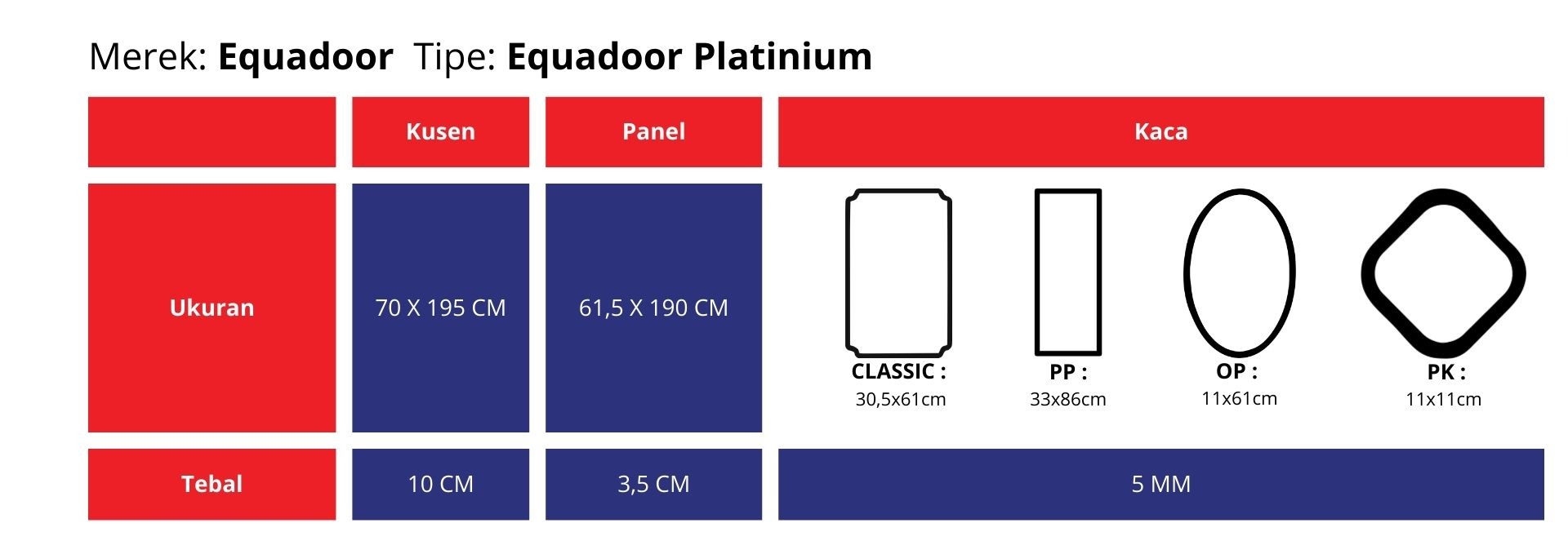 Equadoor, Pintu PVC terbaik di kelasnya. Equadoor hadir dengan kusen profil tebal Maspion 10 cm dan panel kualitas top dari Puso. Perbedaan Equadoor Platinium dan Premium terletak pada kaca dan motif. Kaca Equadoor Platinium adalah kaca Exsa, menghadirkan kesan simpel dan eksklusif dengan warna netralnya. Sedangkan, kaca Equadoor Premium adalah kaca Sandblast dengan nuansa flora alam senantiasa memberikan kehangatan. Motif untuk Platinium adalah Garis & Tikar, sedangkan Premium adalah Urat Kayu dan Polos. Pintu Equadoor diciptakan Plasma Group untuk menemani anda dan bertahan bersama anda, tahun demi tahun.